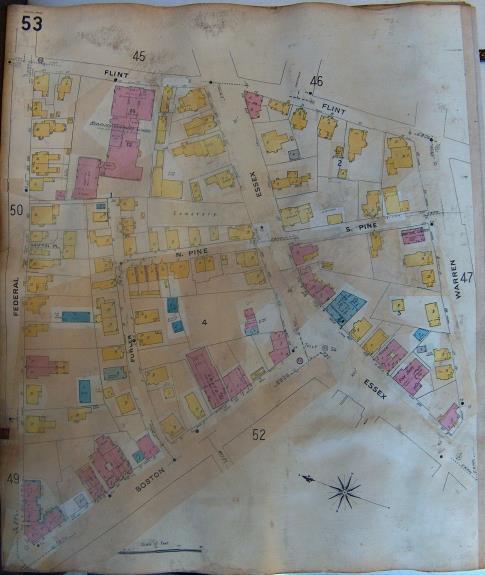 Here’s the atlas for 1890. (Not the greatest quality print, but love the yellows and pinks!) The footprint is bigger and still has an “X” over it, so now we know where we are and approximately when we were built. (Fun[?] fact: Pine St. also became N. Pine and S. Pine at some point between the 1874 and 1890 atlases.) What’s the next atlas look like…?